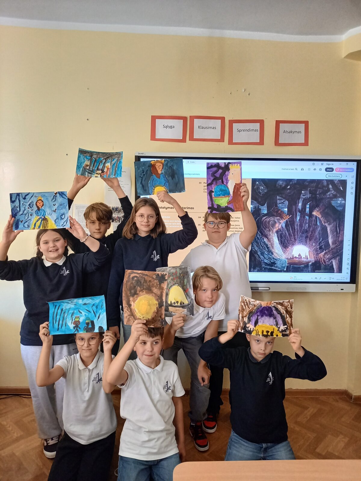4b klasės mokiniai klausė pasakojimo apie Kastuką vaikystėje. Pratęsė jo darbą ,,Karalių pasakos“, bandydami įsivaizduoti, kad yra kažkurioje paveikslo vietoje. Piešė kaip tada atrodo paveikslas (pvz. jei tupi delne ar ant karūnos).