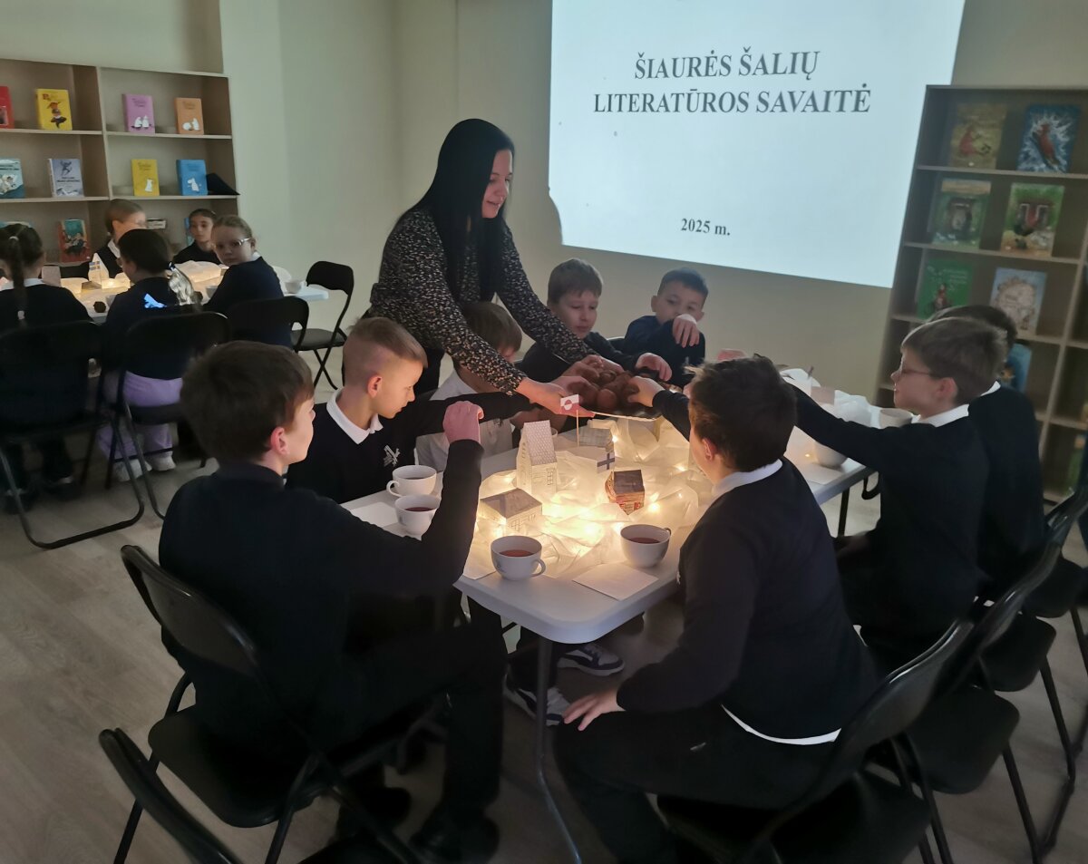Žvakių šviesoje, gurkšnodami iš puodelio šiltą, kvepiančią arbatą ir vaišindamiesi spurgomis, mokiniai klausėsi bibliotekininkės skaitomos knygos „Šuo, katė ir pelė“. Šią knygą sukūrė dailininkas ir rašytojas Bárðuras Oskarssonas iš Farerų salų. Vaikai sužinojo, kaip šuo, katė ir pelė gali gyventi kartu ir smagiai leisti laiką. Svarbiausia – mokėti kalbėtis apie savo problemas.