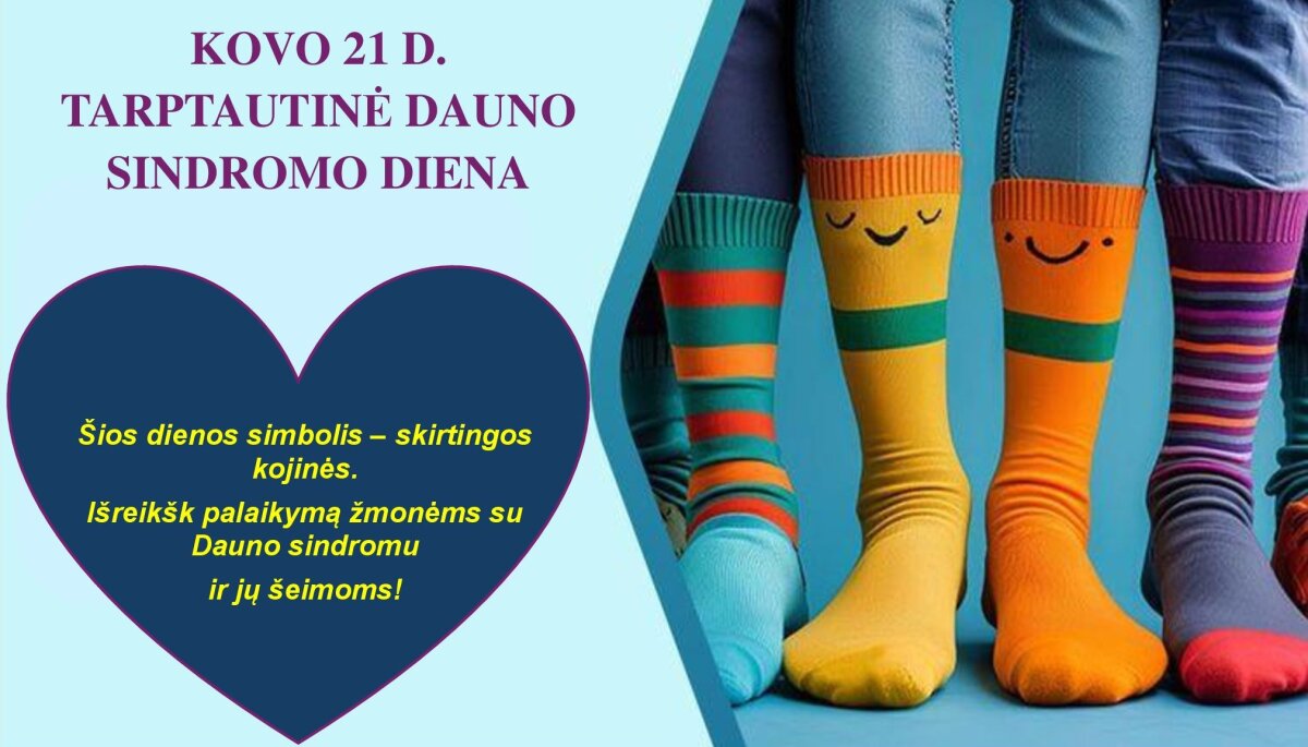Kasmet kovo 21 d. minima Pasaulinė Dauno sindromo diena. Ši diena skirta visame pasaulyje didinti visuomenės supratimą apie Dauno sindromą, skatinti asmenų, turinčių šį sindromą, teisių, socialinės įtraukties ir gerovės palaikymą. Kviečiame šią diena paminėti prisijungiant prie Pasaulinės Dauno sindromo dienos minėjimo akcijos, dėvint skirtingas kojines!