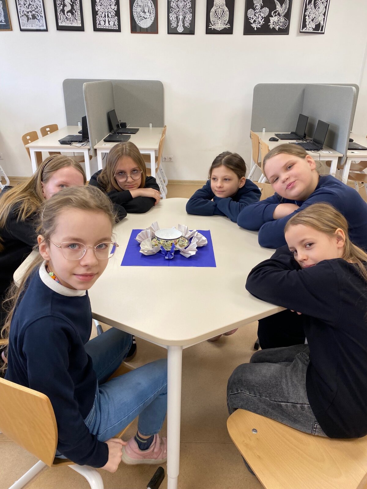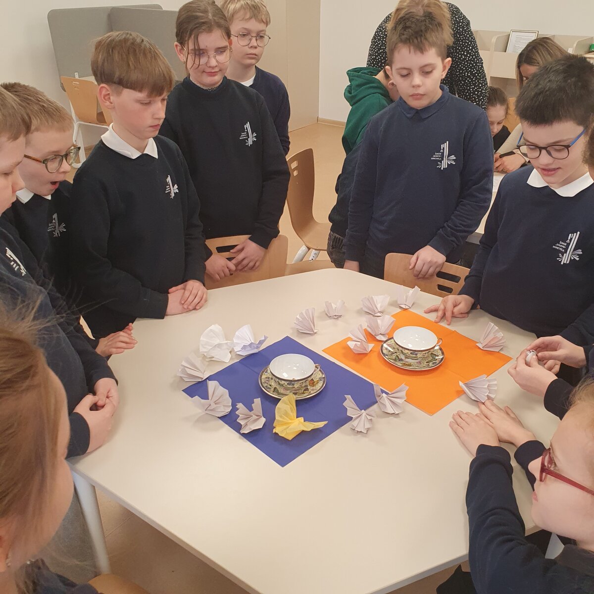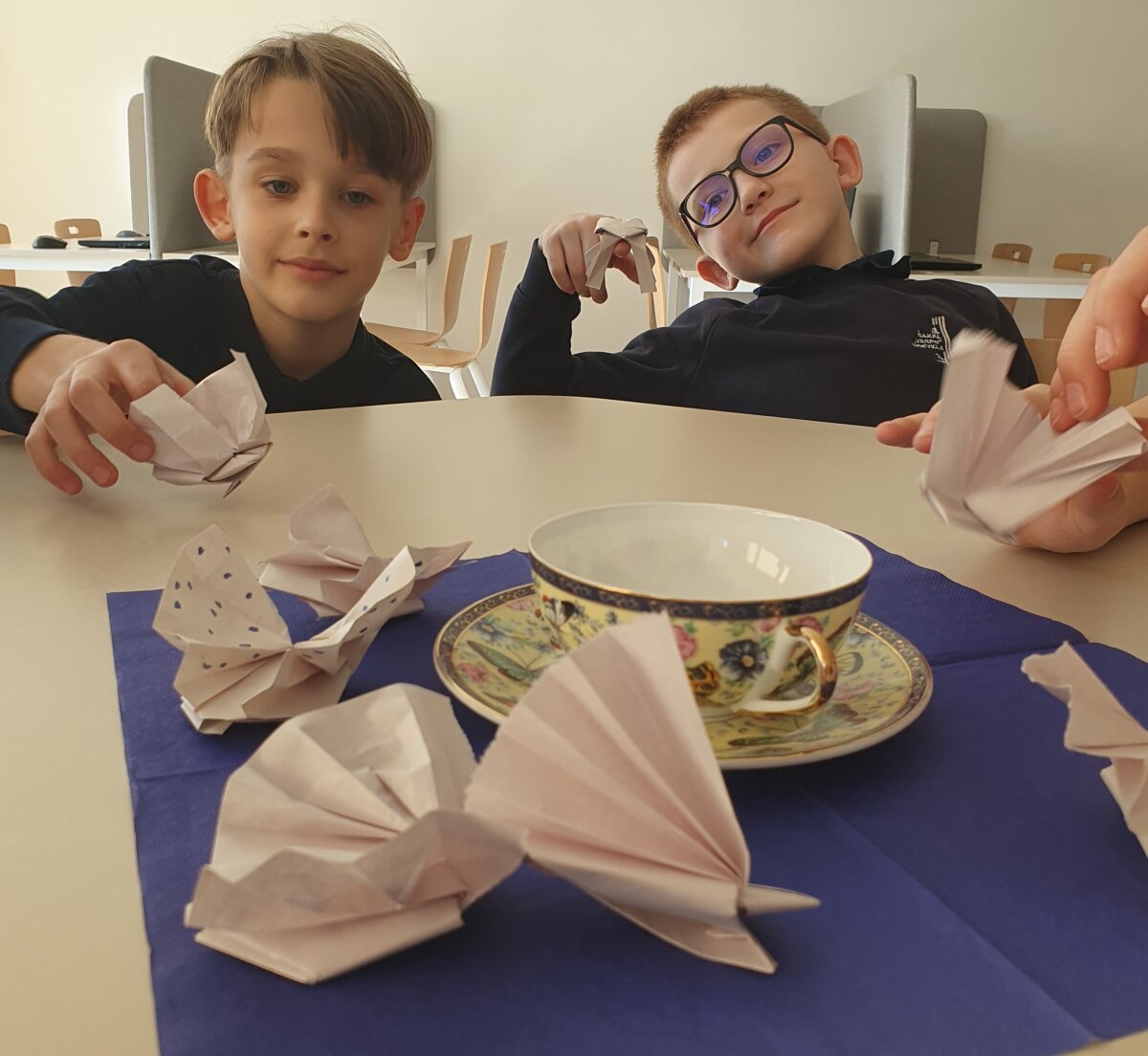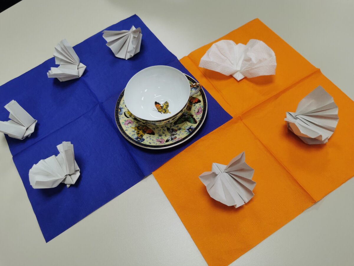 Kūrybinėje dalyje visi kartu, kruopščiai lankstydami popierių, kūrė spalvingus origamio darbelius – drugelius ir paukštelius. Kiekvienam pavyko, o šie trapūs kūriniai tapo ne tik džiugiu prisiminimu, bet ir mielu papuošimu prie arbatos puodelio.