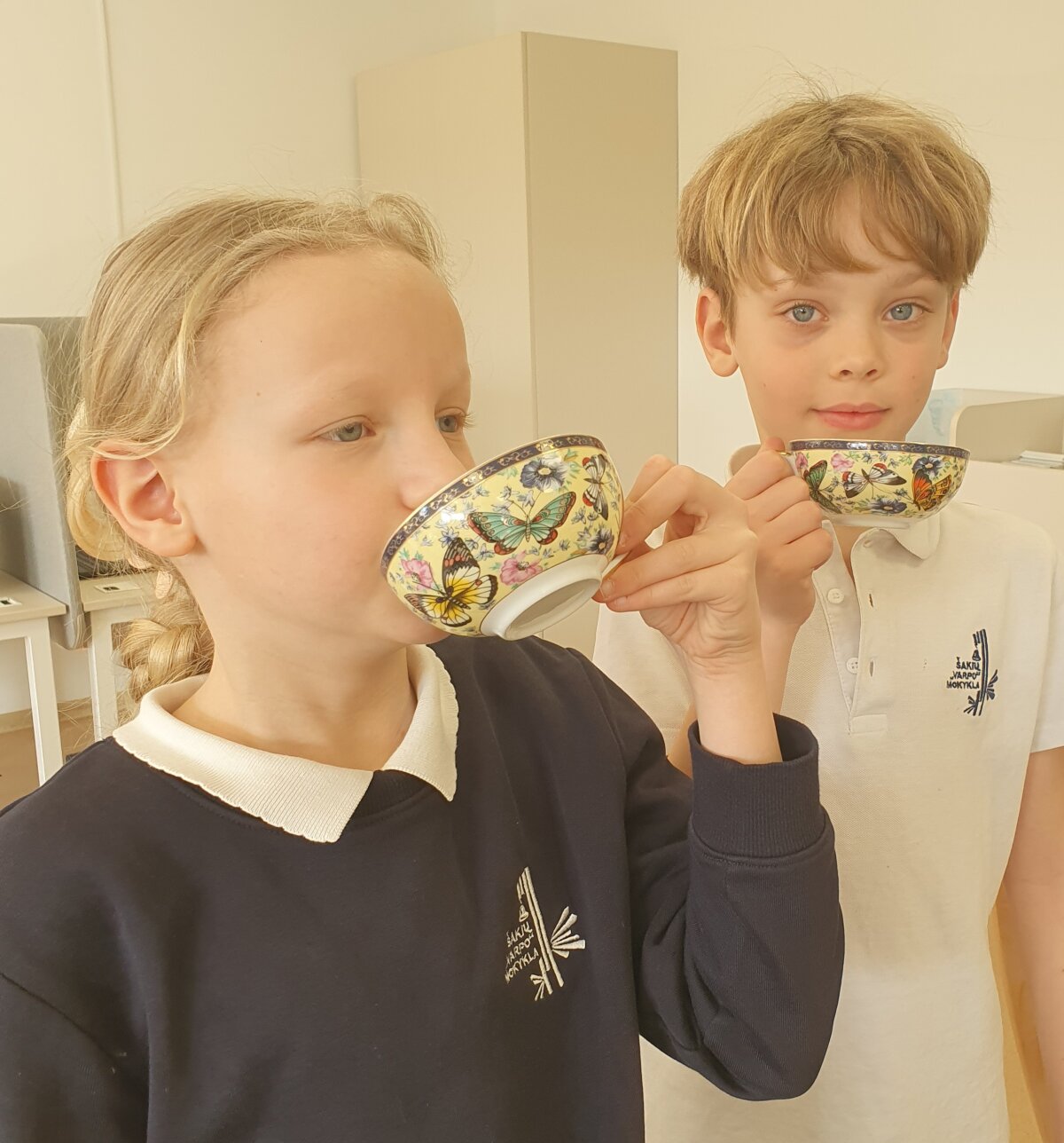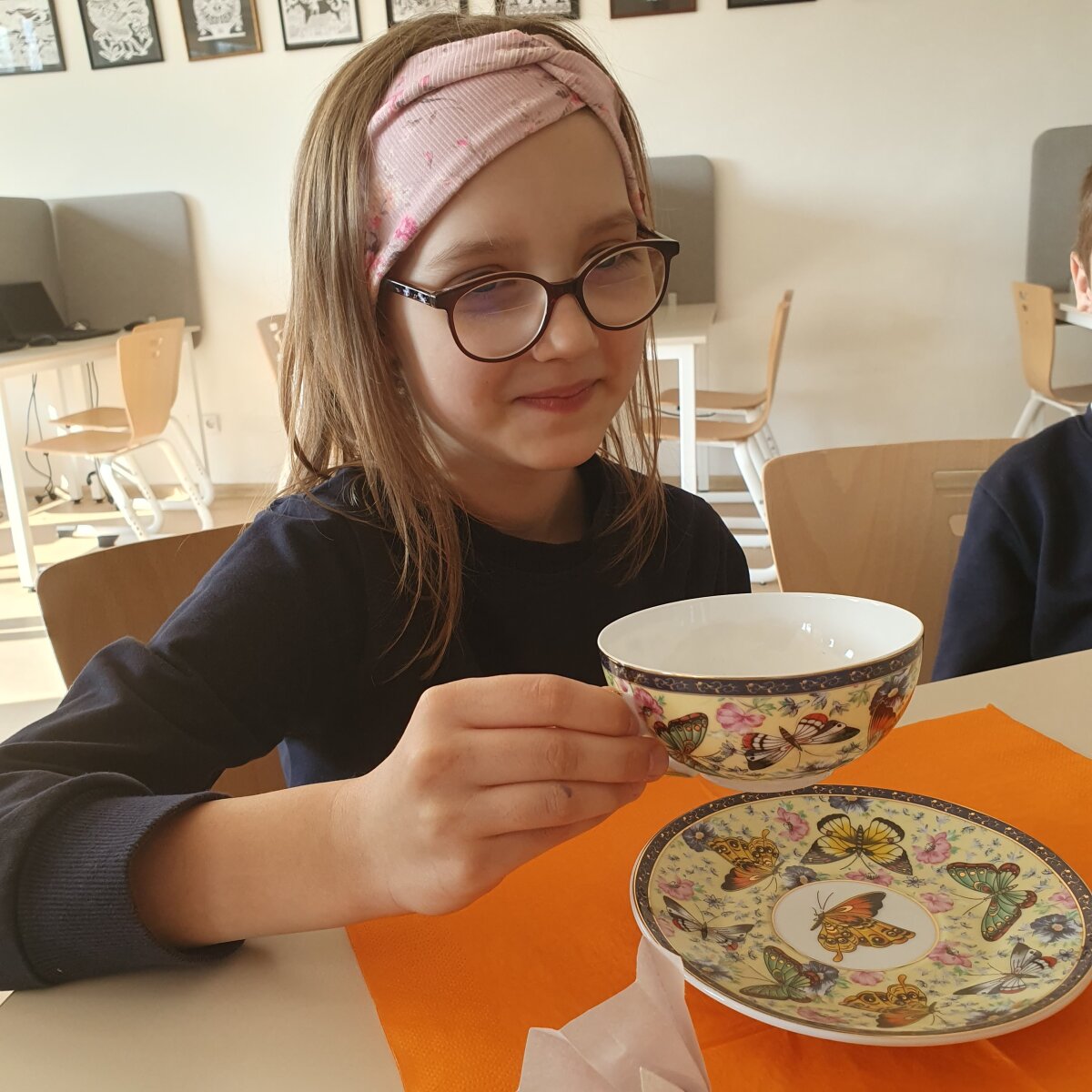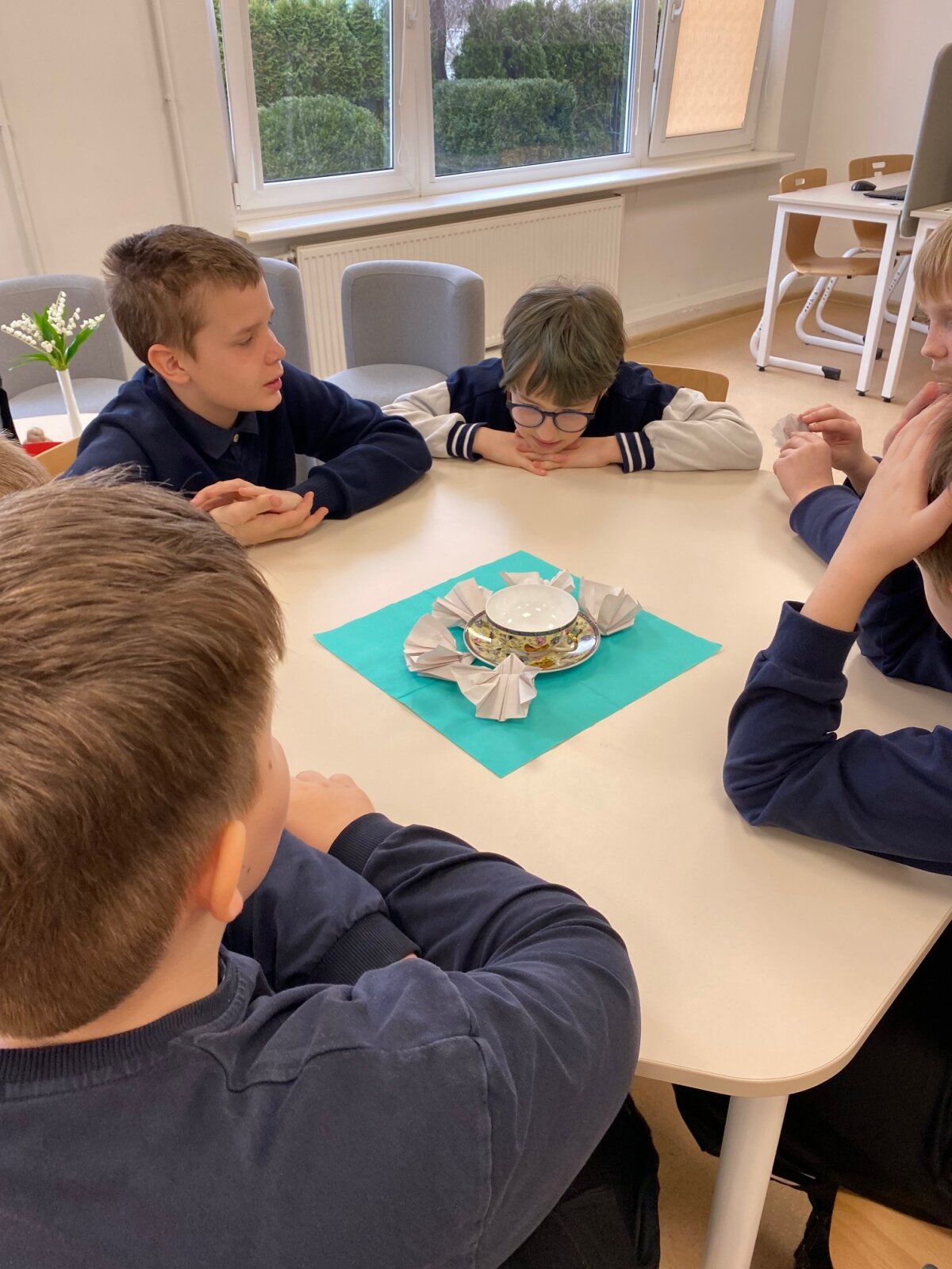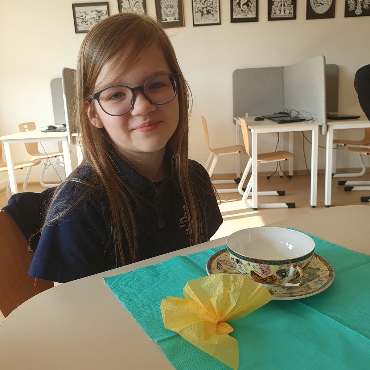 Kūrybinėje dalyje visi kartu, kruopščiai lankstydami popierių, kūrė spalvingus origamio darbelius – drugelius ir paukštelius. Kiekvienam pavyko, o šie trapūs kūriniai tapo ne tik džiugiu prisiminimu, bet ir mielu papuošimu prie arbatos puodelio.