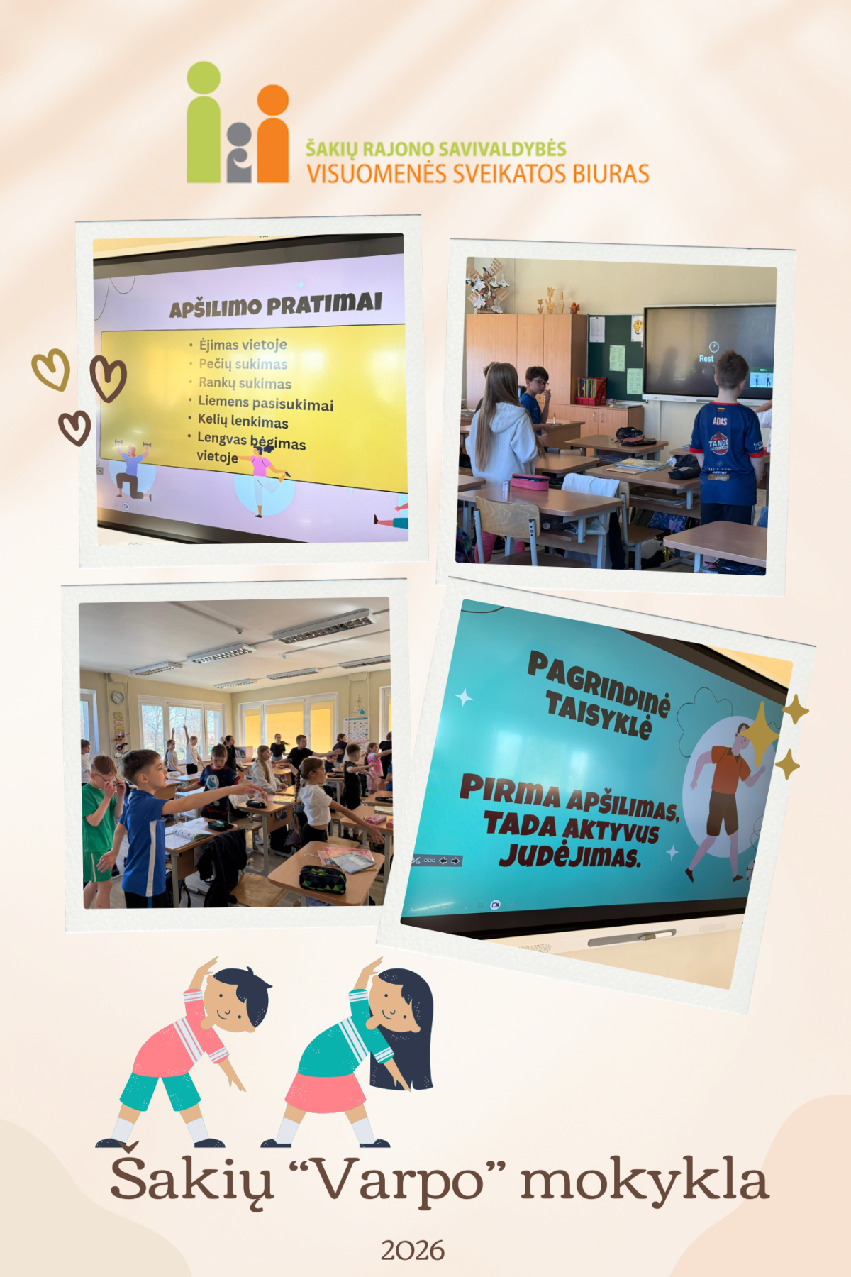 2026 m. balandžio 13 d. Šakių „Varpo“ mokyklos 3C klasės mokiniams vyko aktyvioji pamoka, kurios metu vaikai mokėsi apšilimo ir tempimo pratimų bei aiškinosi, kuo jie skiriasi.