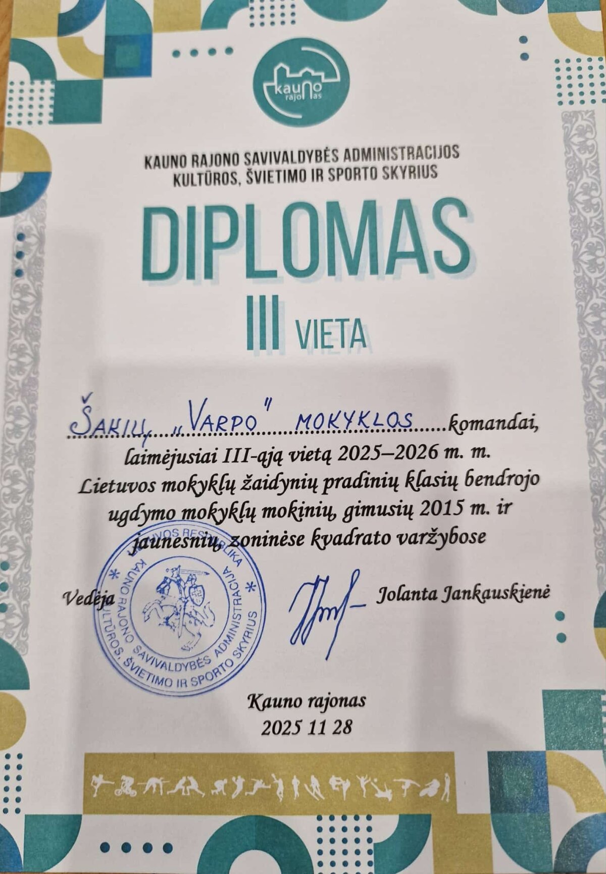 Pradinių klasių komanda dalyvavo Lietuvos mokyklų žaidynių kvadrato zoninėse varžybose, kurios vyko Kauno r. Ringaudų pradinėje mokykloje. Komanda iškovojo trečiąją vietą.