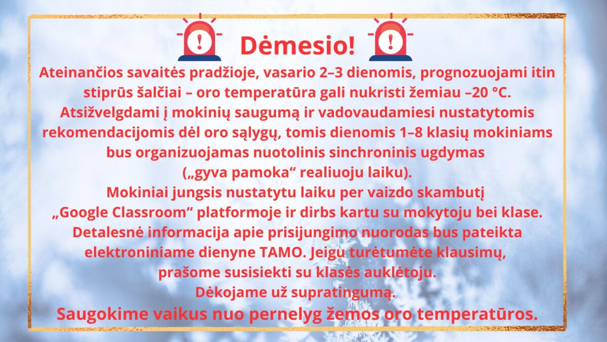Atsižvelgdami į mokinių saugumą ir vadovaudamiesi nustatytomis rekomendacijomis dėl oro sąlygų, tomis dienomis 1–8 klasių mokiniams bus organizuojamas nuotolinis sinchroninis ugdymas („gyva pamoka“ realiuoju laiku).